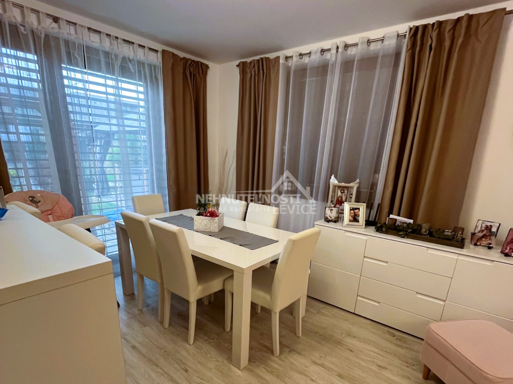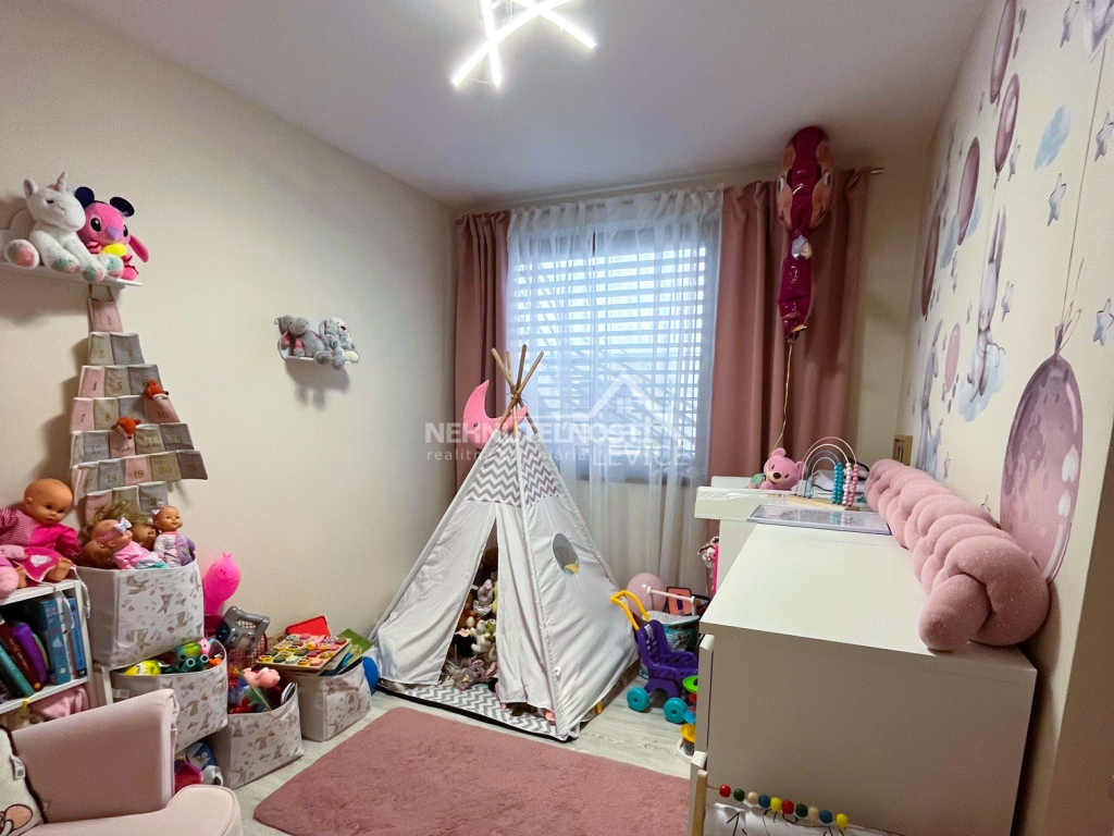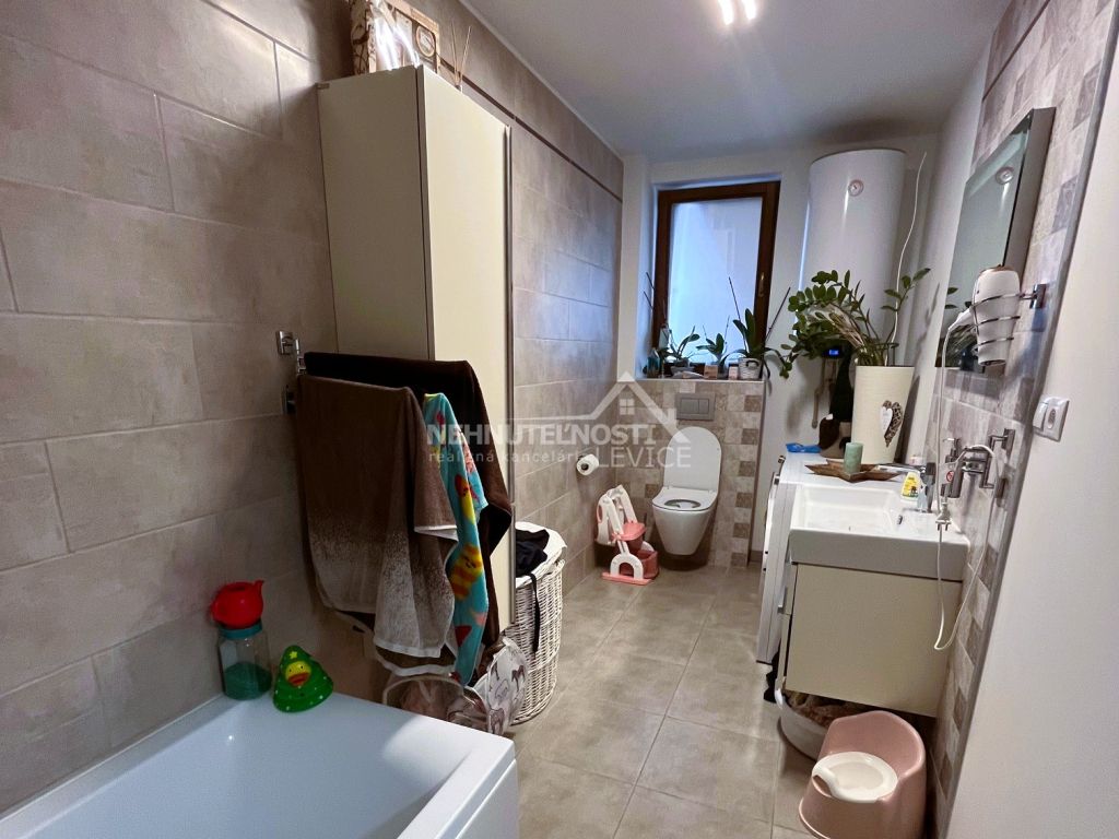 Byt pozostáva so vstupnej chodby, kúpeľni spojenej s toaletou, špajzy, vstavaného šatníka, so spálni, detskej izby a obývačka je moderne prepojená s kuchyňou. Z obývačky a z kuchyni je východ na terasu domu.