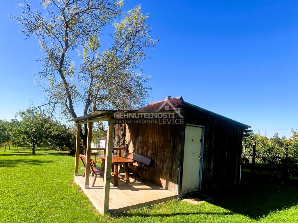 Na pozemku sa nachádza menší drevený záhradný domček vhodný na oddych s vonkajším posedením.